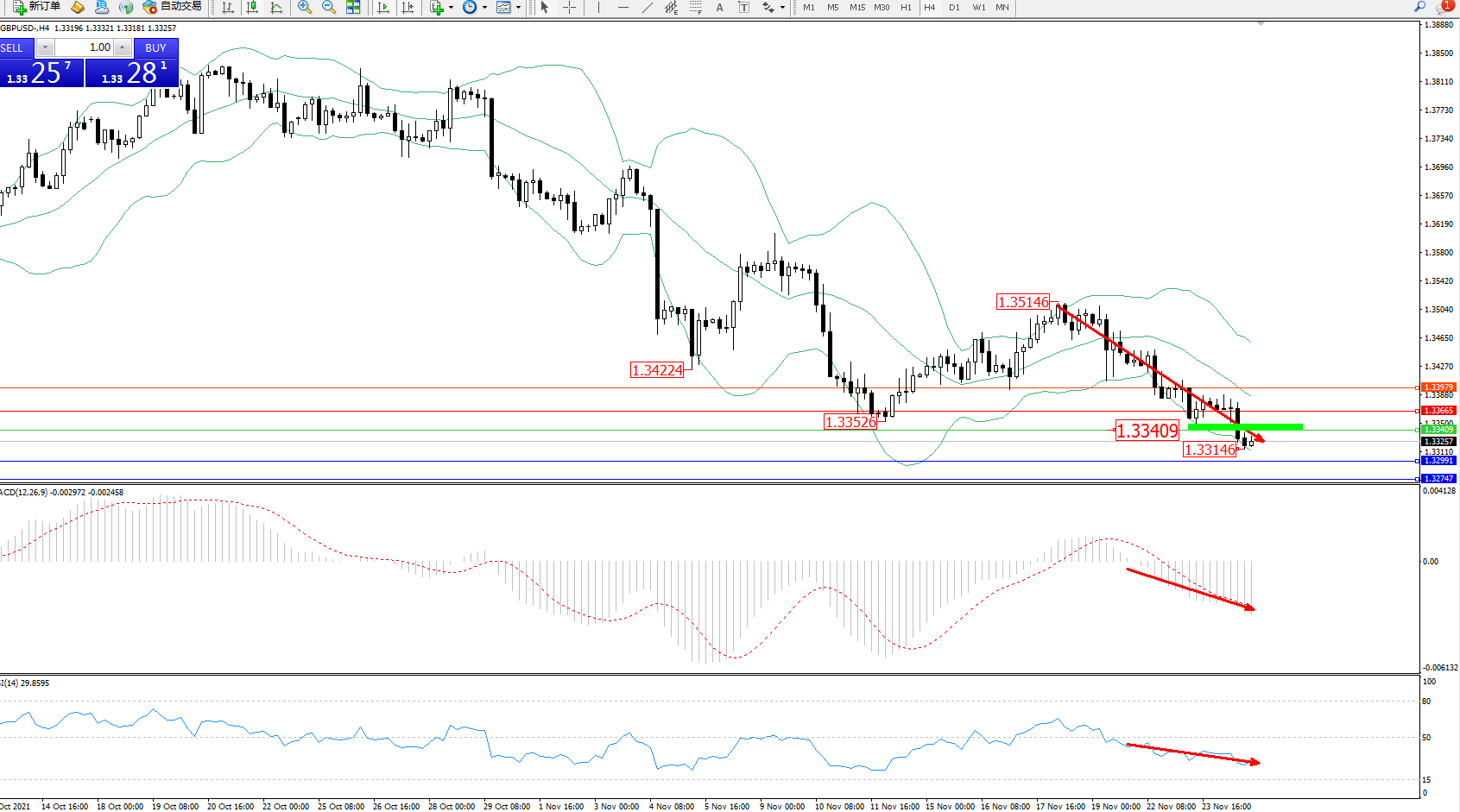 技术点评:空头动力延续布林带指标通道中下轨区间持续震荡下行,低位抵达1.33146位置后开始整理,短期空头动力有继续下行迹象,布林带指标呈收口走势持续下行,MACD指标处于空头区域维持整理持续向下移动中,RSI指标处于空头区域维持弱势整理平缓下行;