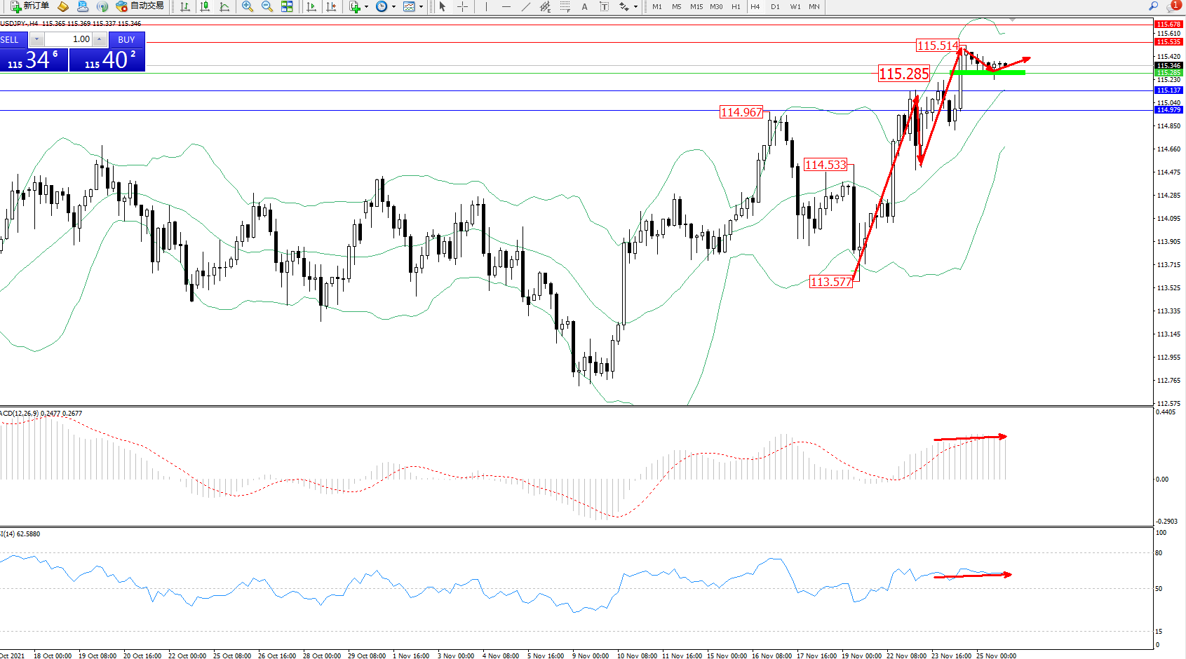 交易策略:115.285上方看涨,目标115.535、115.678