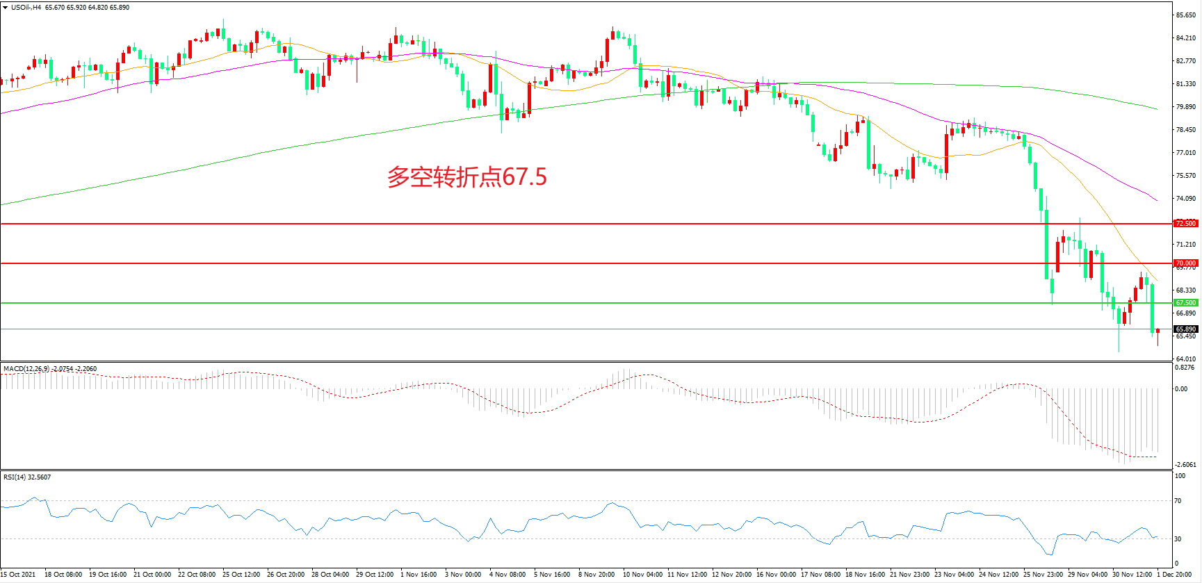 交易策略: 在67.50之下看跌,目标65.00 62.00