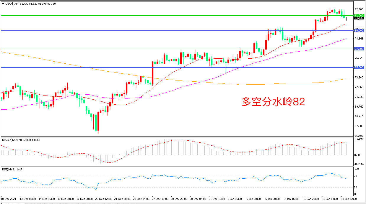 4小时图看,油价长阳拉升后小幅回落,整体表现依然偏强,均线系统呈多头排列,82美元成为多空分水岭,MACD红柱缩短,RSI指标走平,日内震荡上行概率较大。