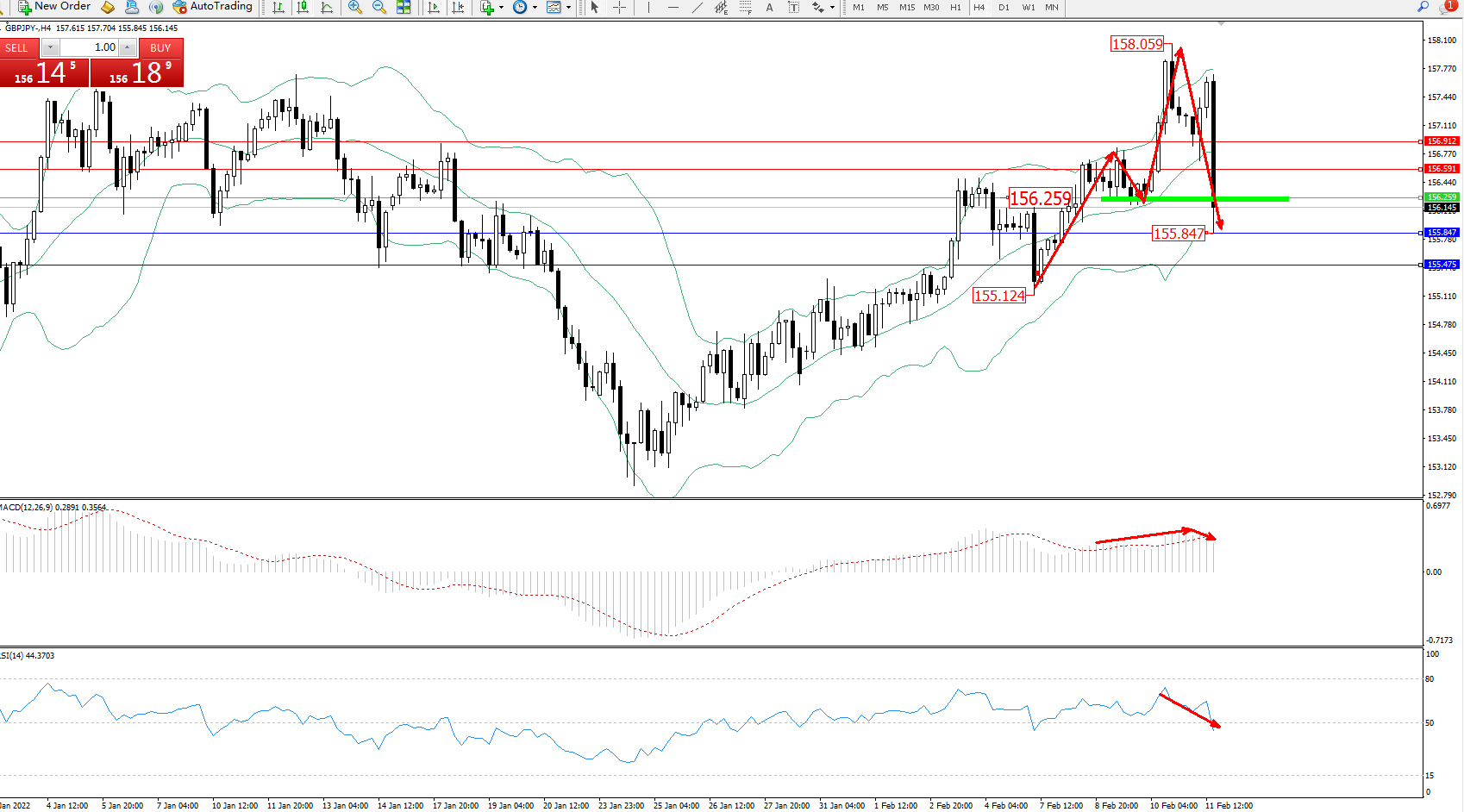 交易策略:156.259下方看跌,目标155.847、155.475