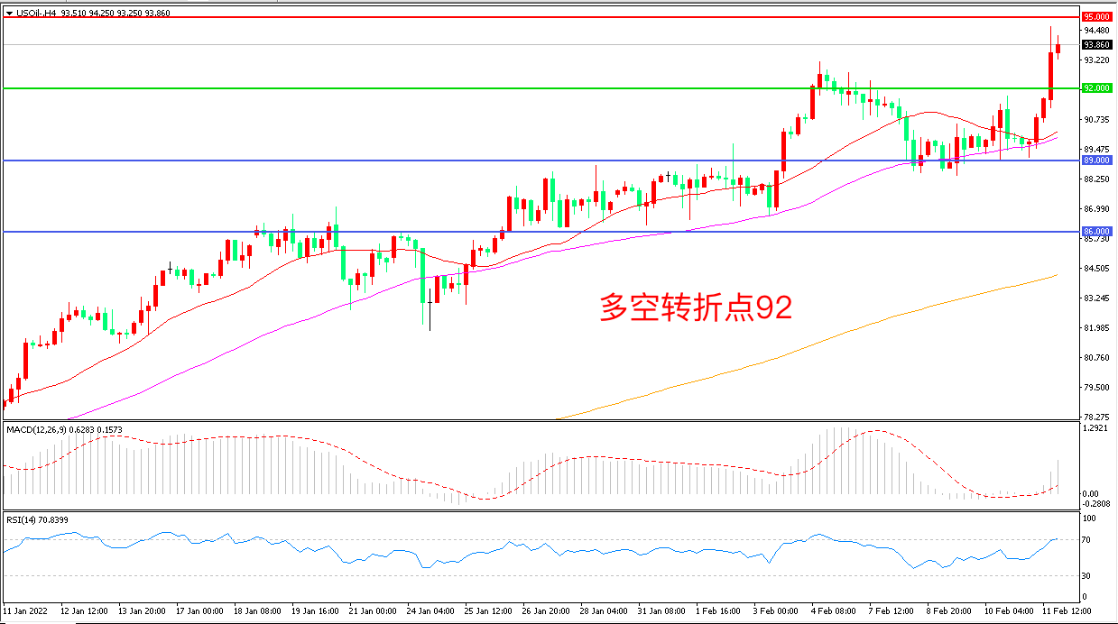 4小时图看,油价回踩均线后再度上行,短期走势偏强, 92美元一线被突破,MACD红柱增加,RSI指标走平,日内震荡上行概率较大。