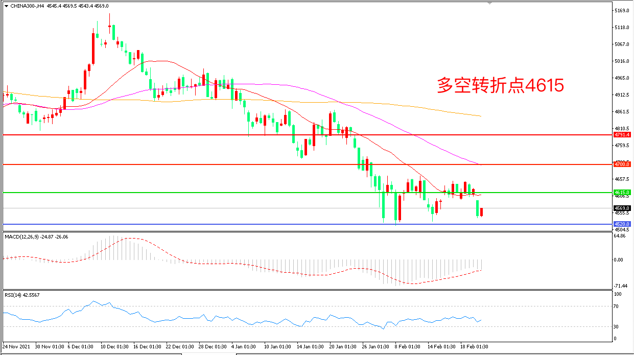 4小时图看,沪深300低开低走,整体表现低迷,均线系统走平, MACD绿柱缩短,RSI指标走平,日内震荡下行概率较大。