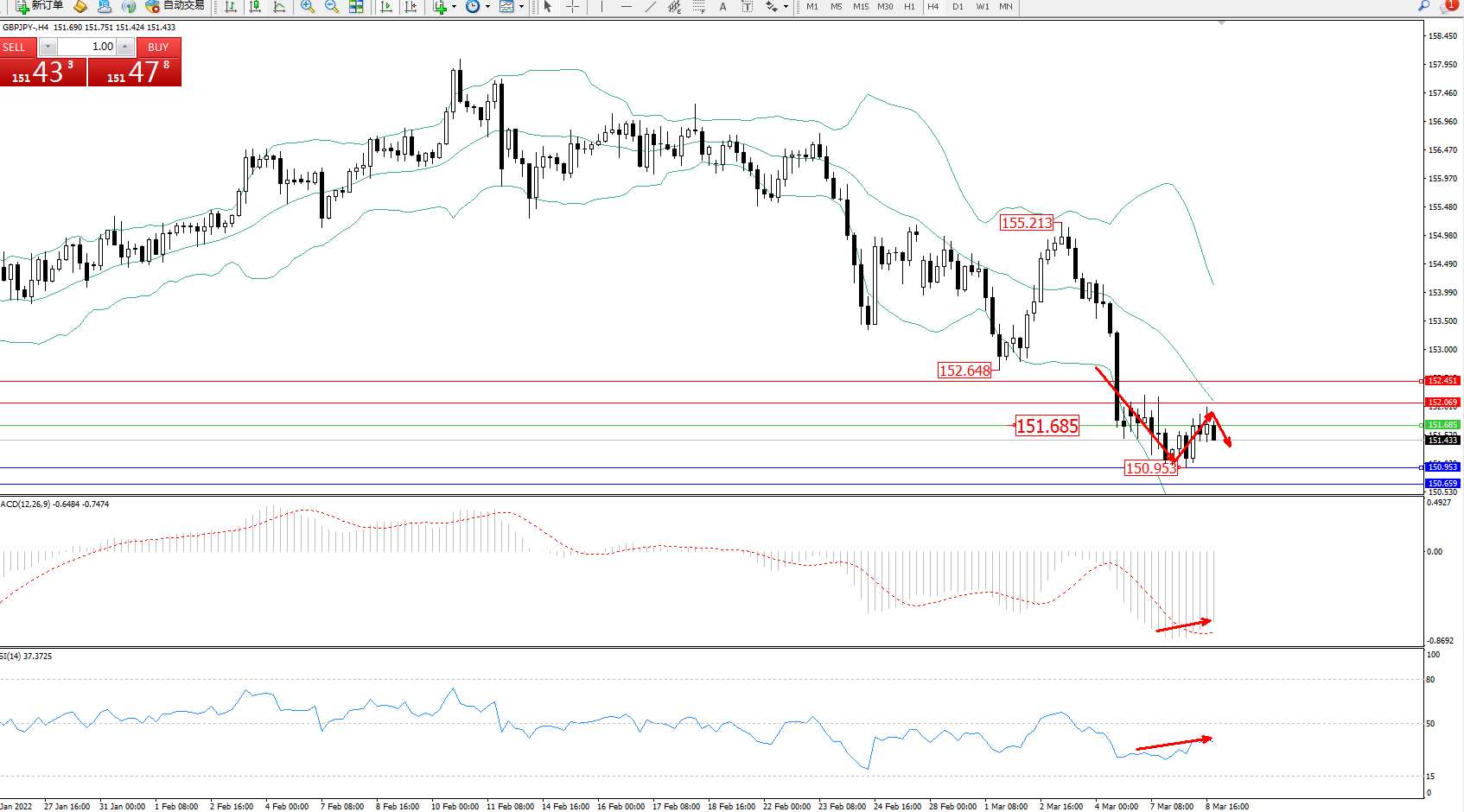 技术点评:空头动力延续布林带指标下轨附近强势下探,低位抵达150.953位置节点后开始短暂整理上移,短期低位窄幅整理平移走势后将持续,但整体下行趋势态势良好,布林带指标呈收口走势持续中,MACD指标处于空头区域低位开始有缓慢上移迹象,RSI指标处于空头区域缓慢整理向上徘徊;