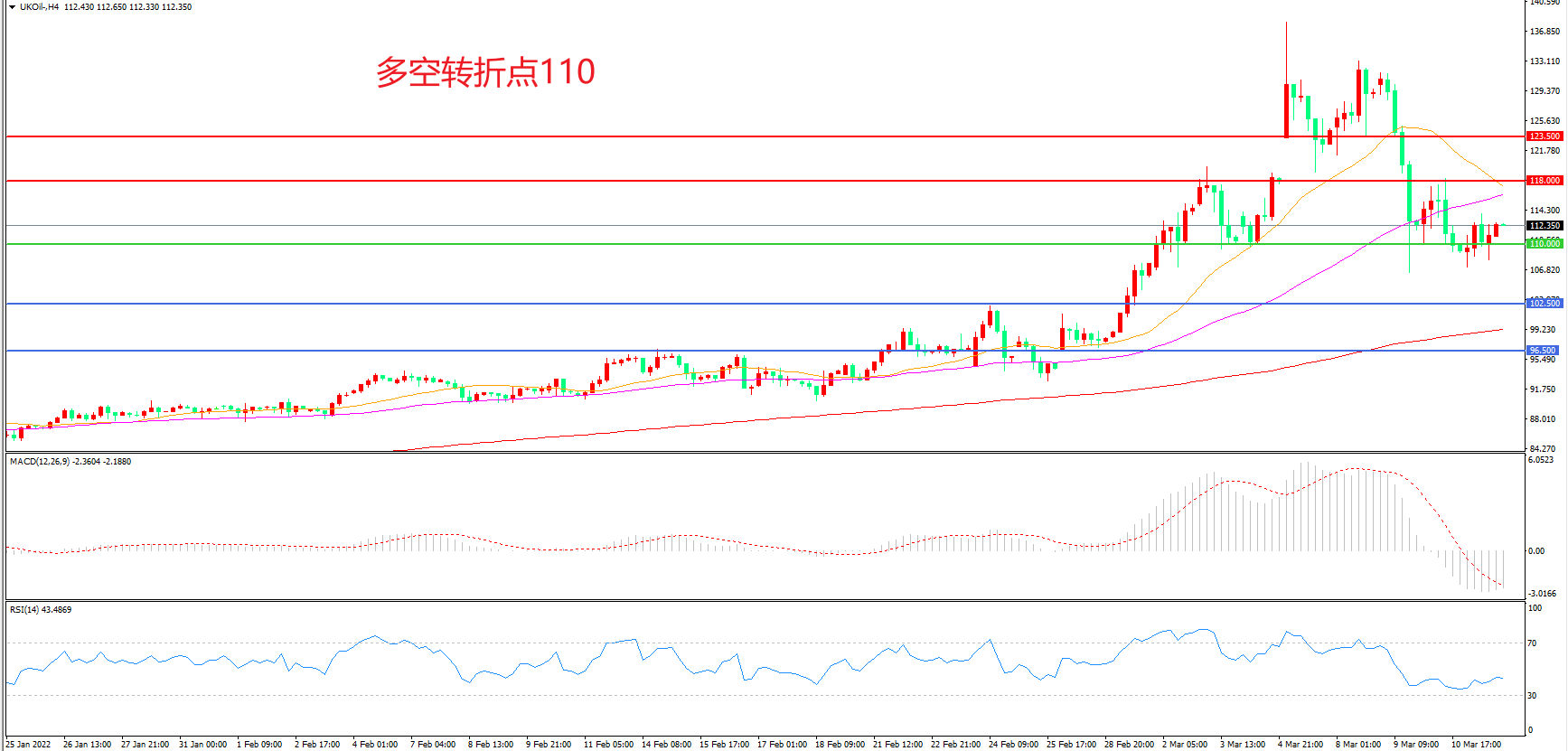 4小时图看,油价连续下破后窄幅震荡,短期走势有所企稳,110美元成为多空分水岭,MACD红柱缩短,RSI指标走平,日内延续震荡概率较大。