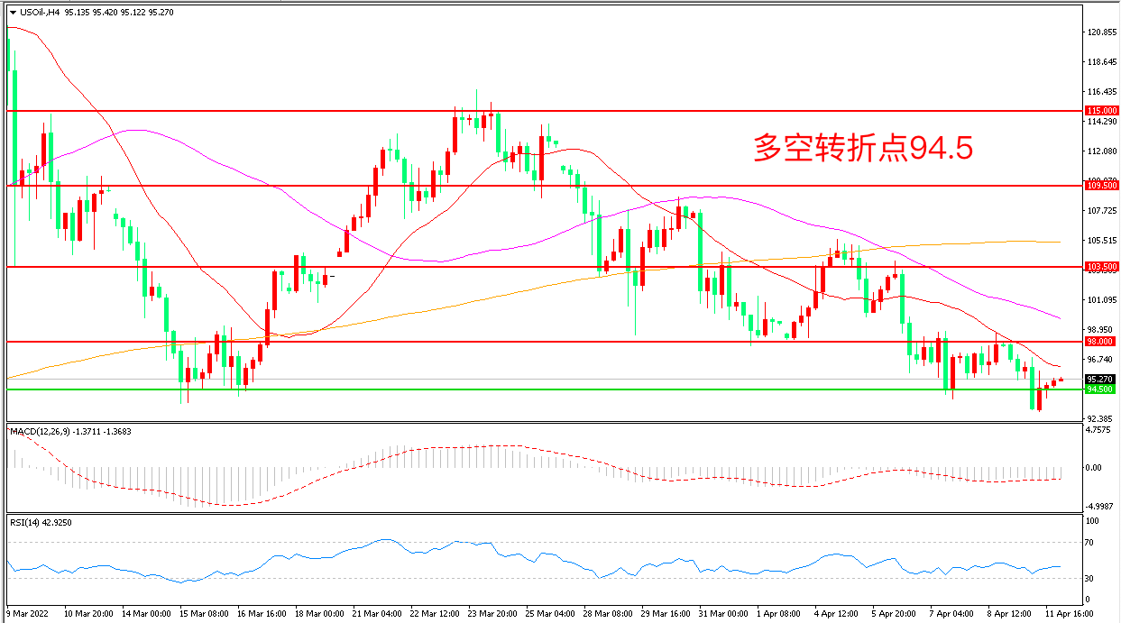 4小时图看,油价跌破94.5美元后小幅反弹,弱势震荡迹象明显,均线系统呈空头排列,MACD绿柱增加,RSI指标走平,日内冲高回落概率较大。