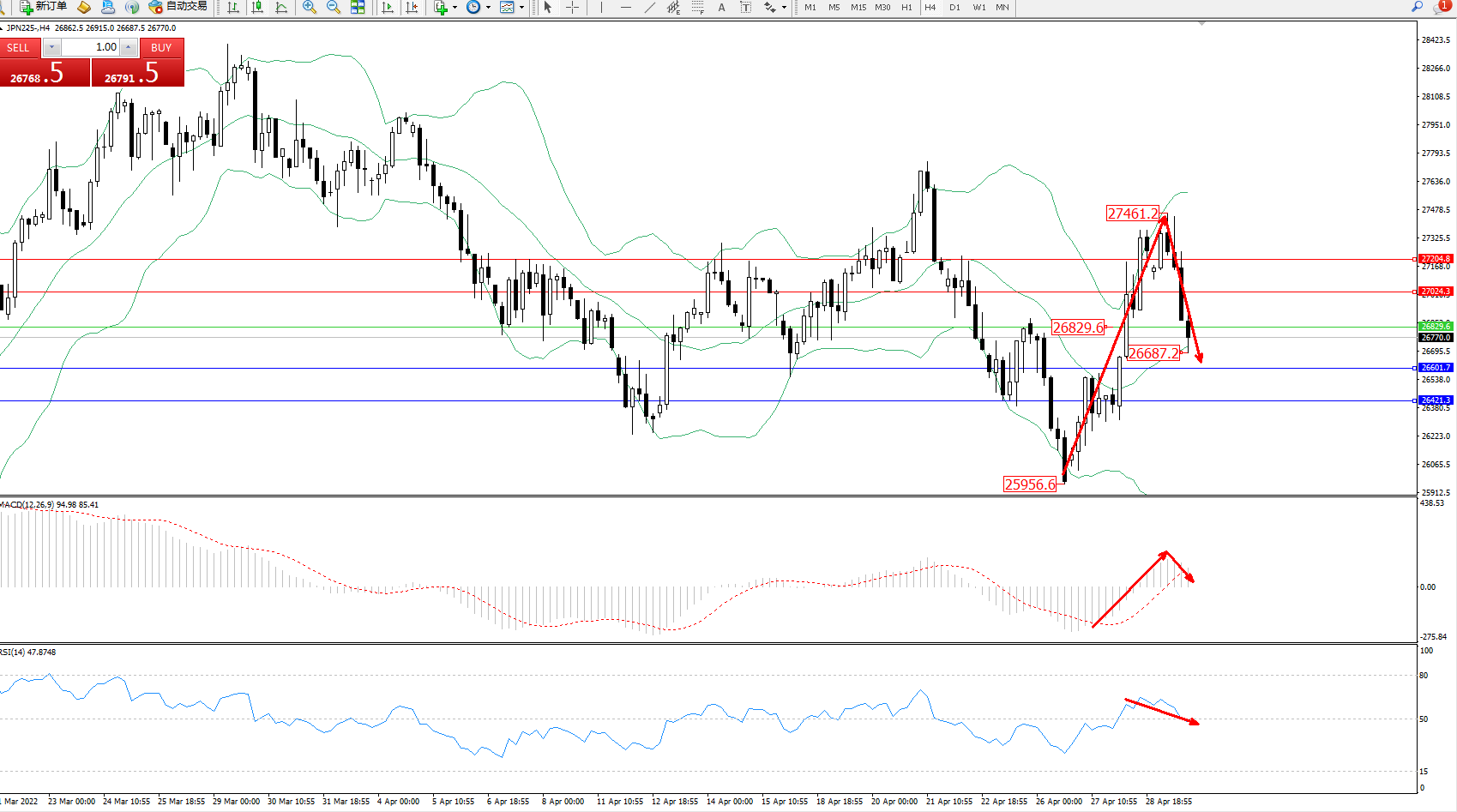 日經指數JPN225——4小時K線圖顯示:
