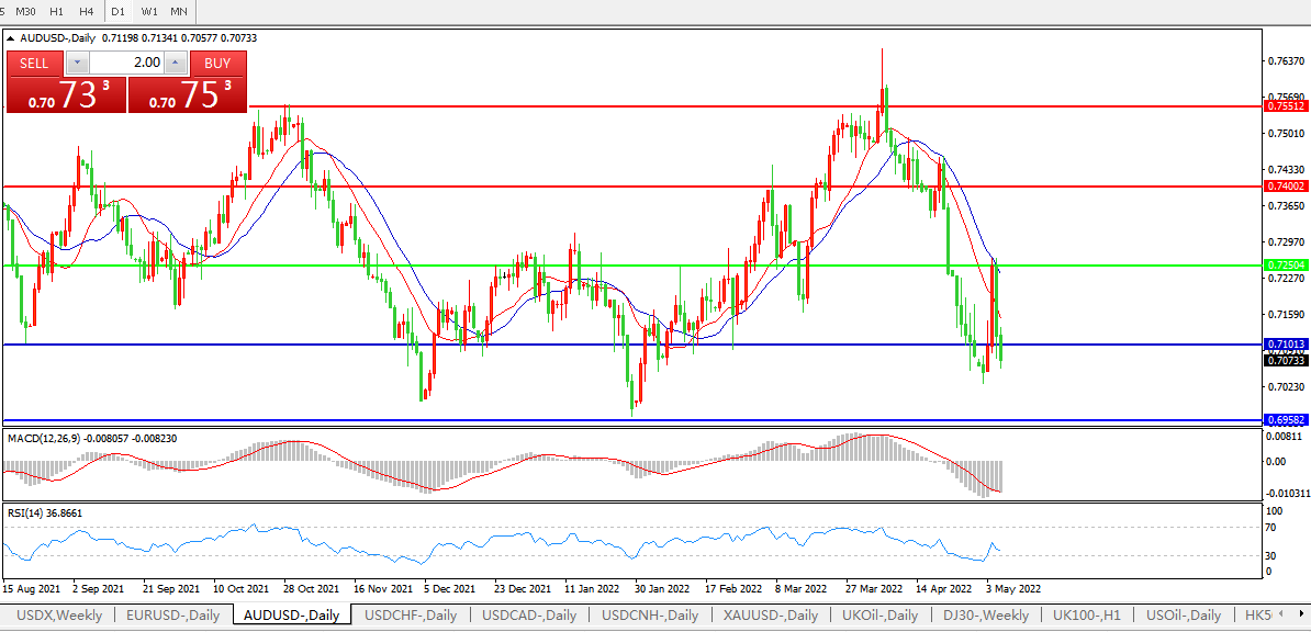 本周澳元兑美元涨0.16%至0.7070,周二,澳洲联储甚至也宣布加息25个基点,将基准利率从历史低点0.1%上调至0.35%,超出市场预期的0.25%。这是澳洲联储2010年以来的首次加息,同时也是近15年来首次在澳大利亚大选期间加息。并且澳洲联储还暗示将进一步加息,推动澳元和债券收益率走高。