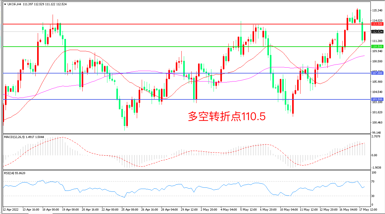 周二(5月16日),沙特能源部长萨勒曼在巴林的一次能源会议中表示,目前炼油能力不足,单靠增产解决不了问题,布伦特原油触及上方阻力后回落,收报112.52美元/桶。目前美国国内油品供应紧张局面进一步推动了市场的看涨情绪,这也让资金敢于在关键的高位区间上沿附近继续推涨油价,但考虑到目前原油市场的复杂环境,高位震荡格局很难改变。