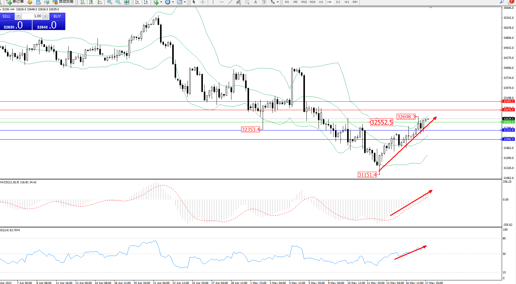 技术点评:低位多头动力延续布林带指标通道中上轨区间持续震荡向上移动,抵达32698附近节点后持续上移,短期多头动力有继续攀升态势,布林带指标呈收口走势不断向上移动,MACD指标处于0轴线上側多头区域维持整理上移中,RSI指标处于50均衡线上側维持整理平移;