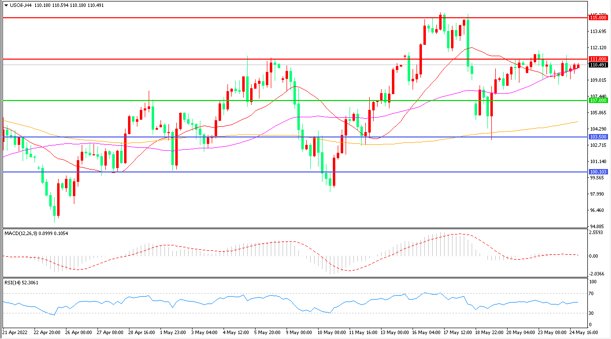 4小时图看,油价触碰111阻力后小幅回落,横盘迹象明显,均线系统走平,MACD红柱缩短,RSI指标走平,日内小幅上行概率较大。