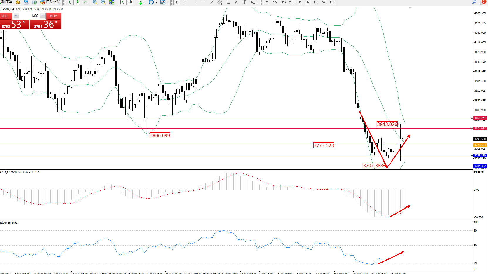 标普SP500——4小时K线图显示: