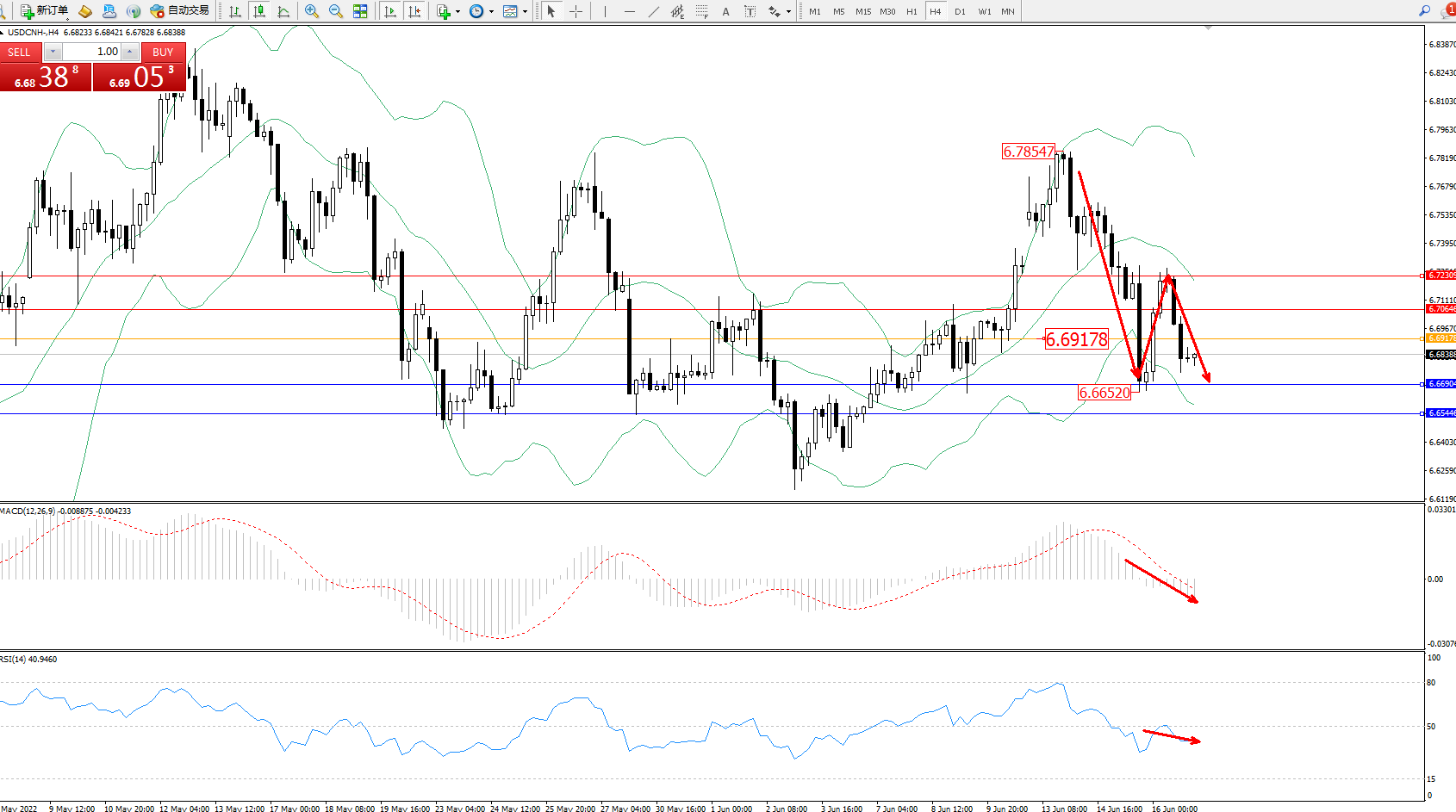 交易策略:在6.69178下方看跌,目标6.66904、6.65446