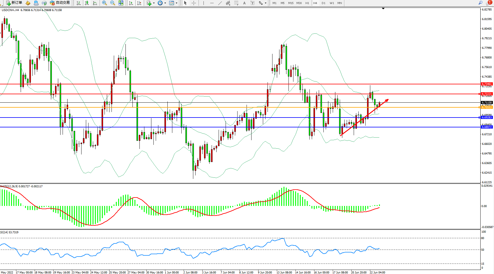 交易策略:6.70553上方看涨,目标6.72221、6.73461