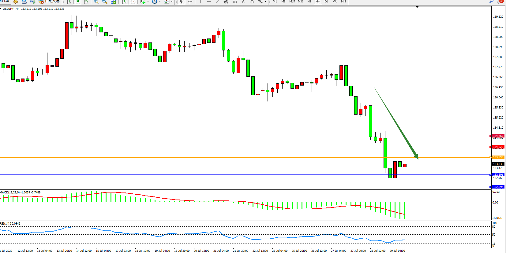 交易策略:133.598下方看跌,目标132.891、132.394