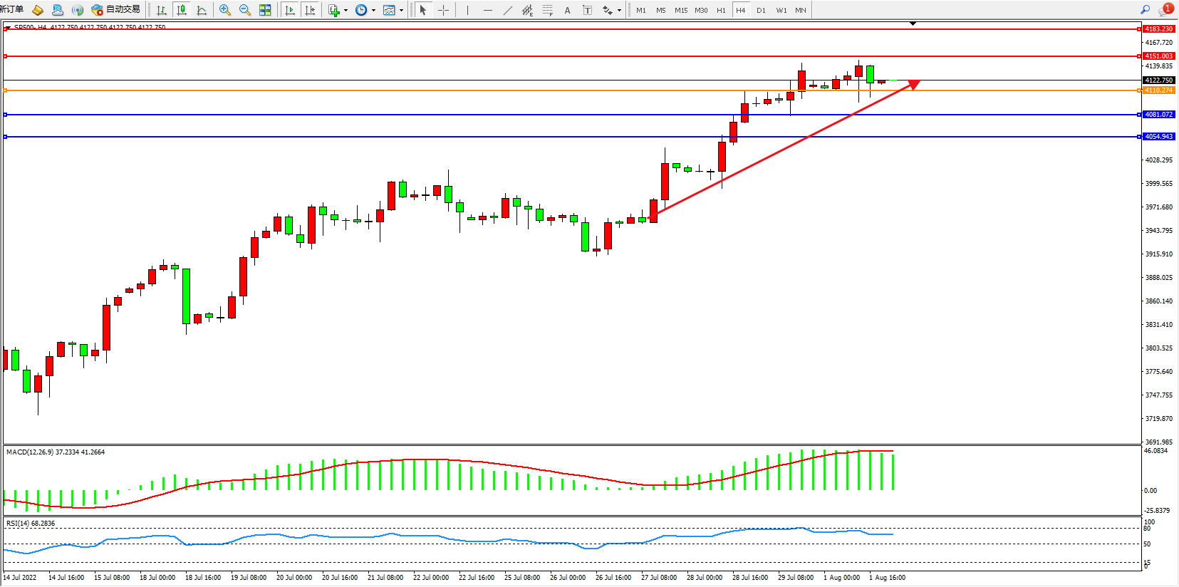 标普SP500——4小时K线图显示: