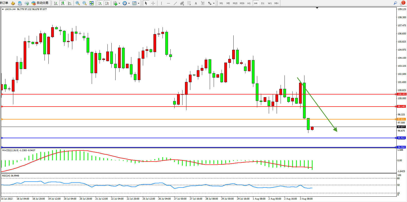 交易策略:97.831下方看跌,目标95.922、94.950