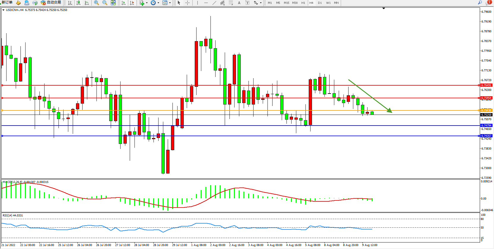 交易策略:6.75430下方看跌,目标6.74794、6.74357