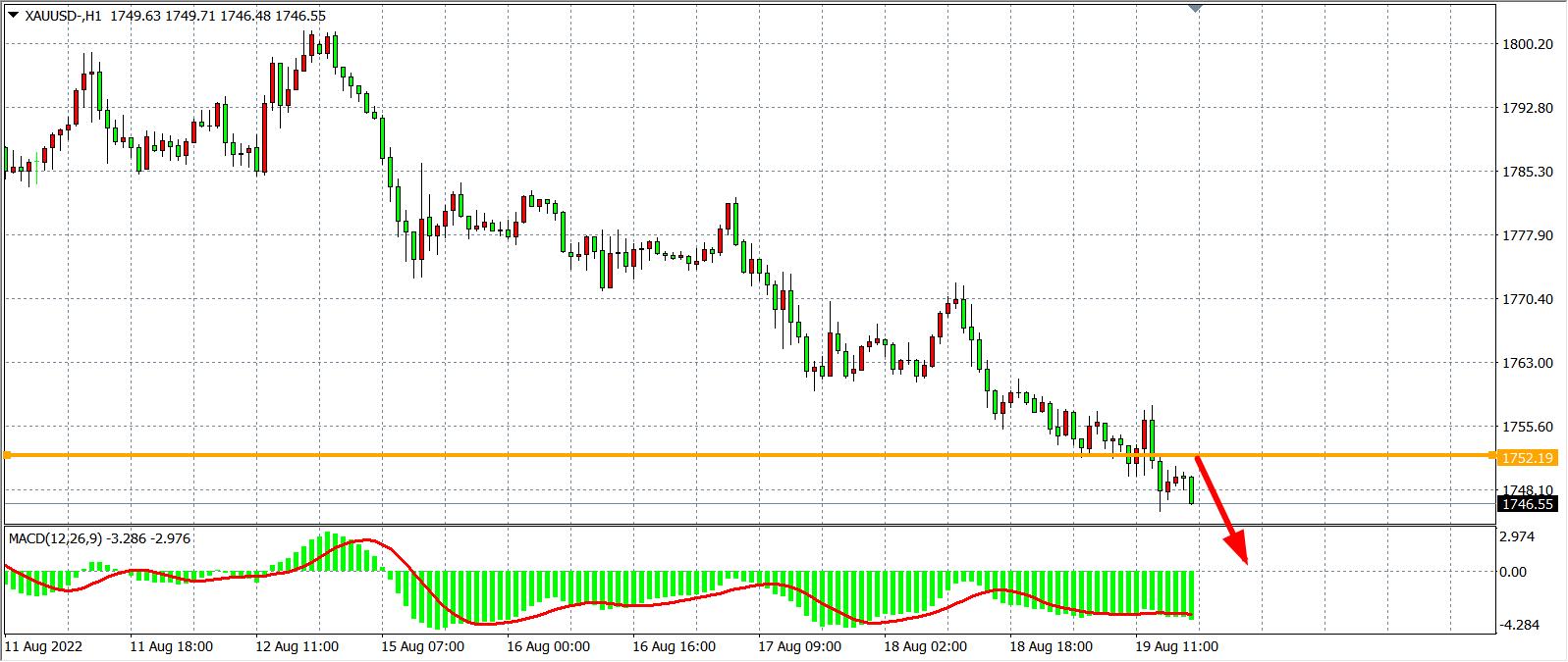 1小时图看,金价继续延续跌势,当前阻力下移至1752,同时MACD于零轴之下呈现持续放量状态,显示行情或延续跌势,日内在1752之下继续看跌为主,下方目标1735-1720