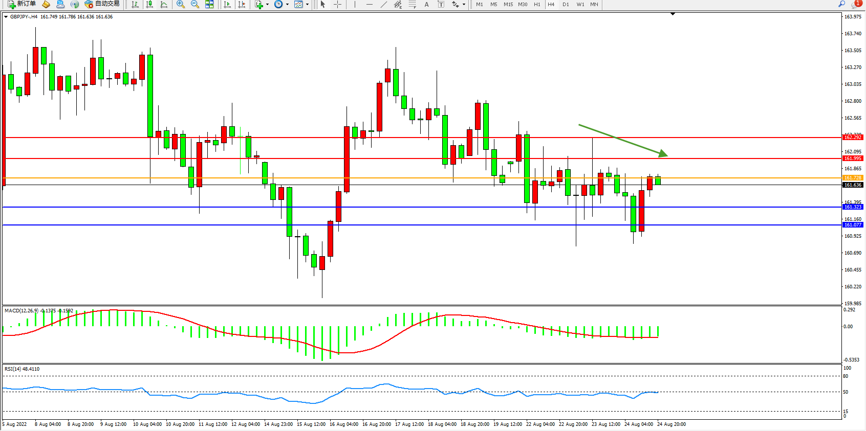 交易策略:161.728下方看跌,目标161.323、161.077