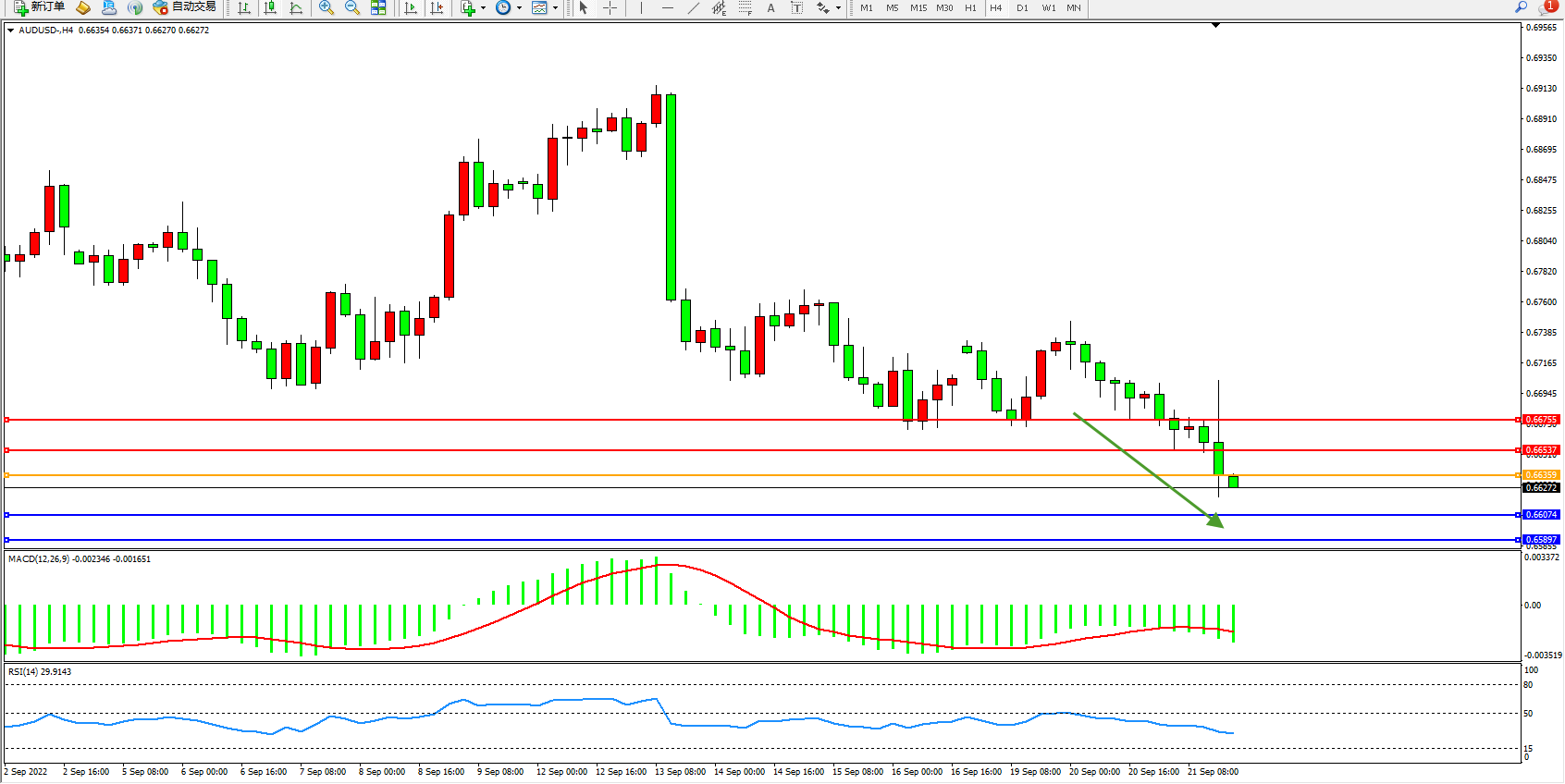 澳元美元AUDUSD——4小时K线图显示: