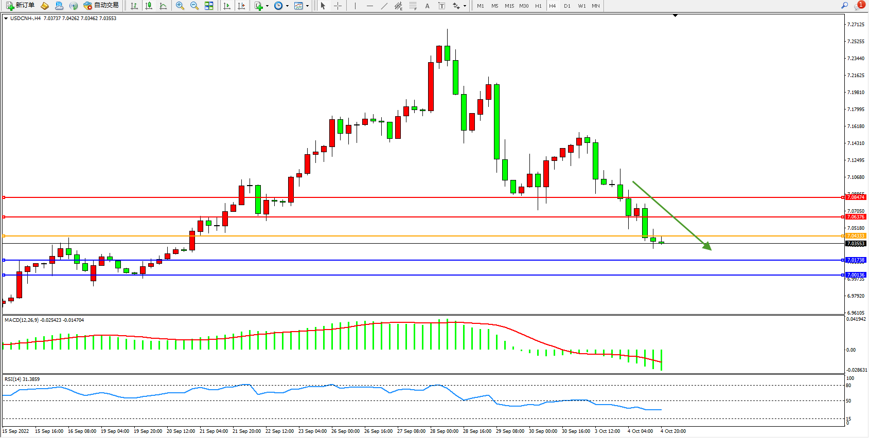 交易策略:7.04333下方看跌,目标7.01738、7.00136