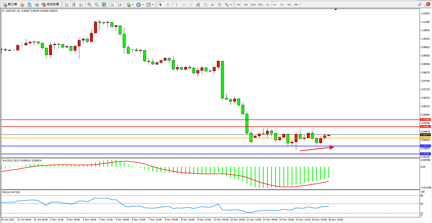 美元瑞郎USDCHF——4小时K线图显示: