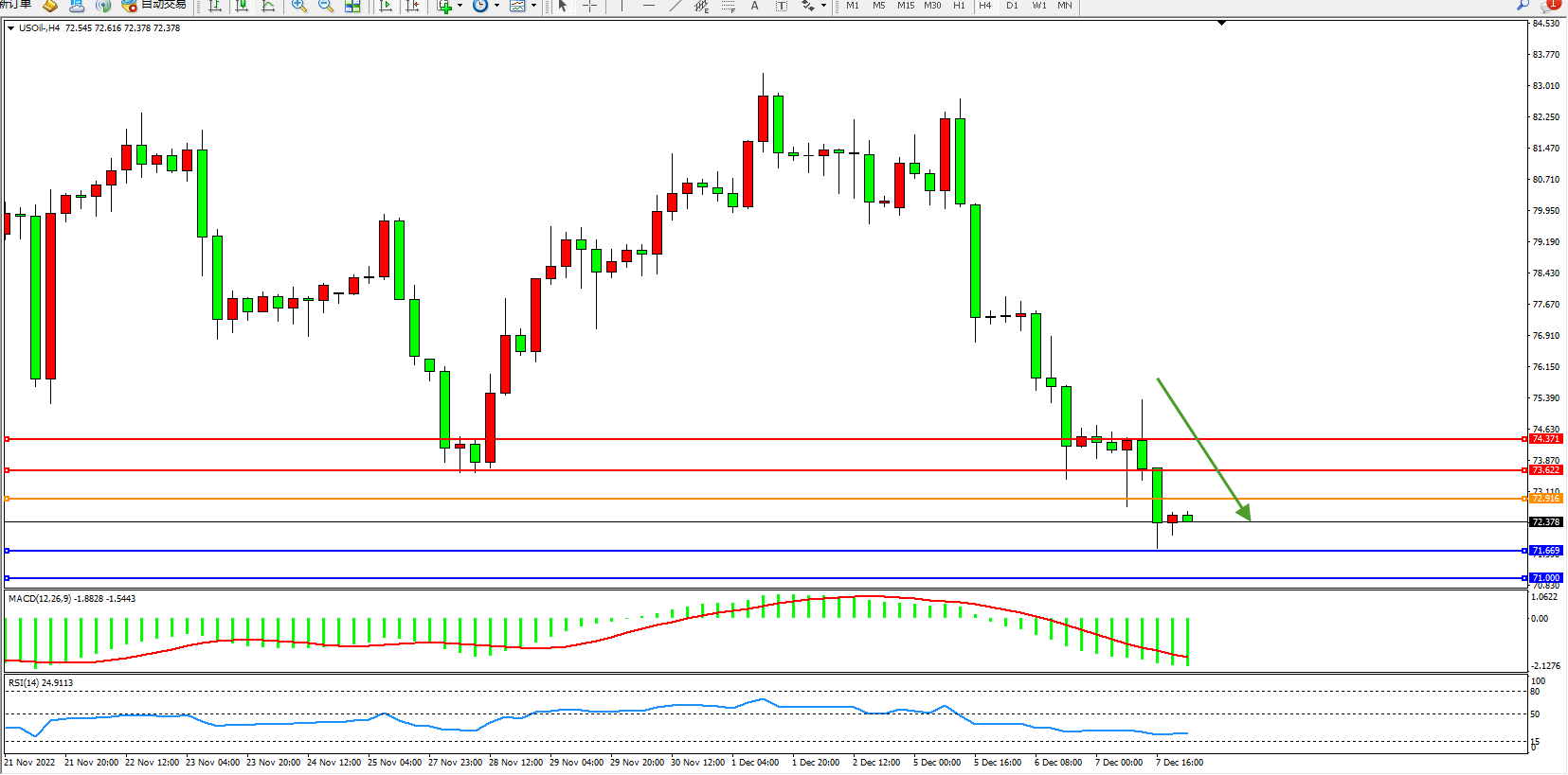 交易策略:72.916下方看跌,目标71.669、71.000