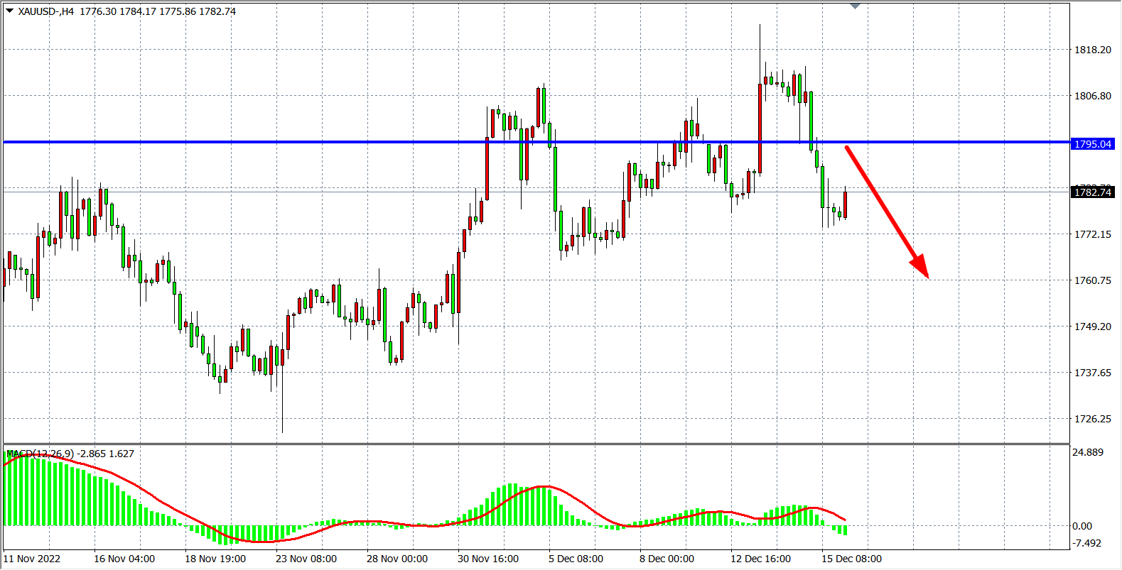 周四(12月15日)公布美国零售销售创11个月最大降幅,一定程度说明美国经济或已正在放缓,加剧了市场在美联储利率决议后对经济衰退的担忧,同时瑞士央行、英国央行和欧洲央行纷纷上调利率,尤其欧洲央行采取了比预期更为激进的立场,现货黄金全日重挫逾30美元,收跌1.69%。