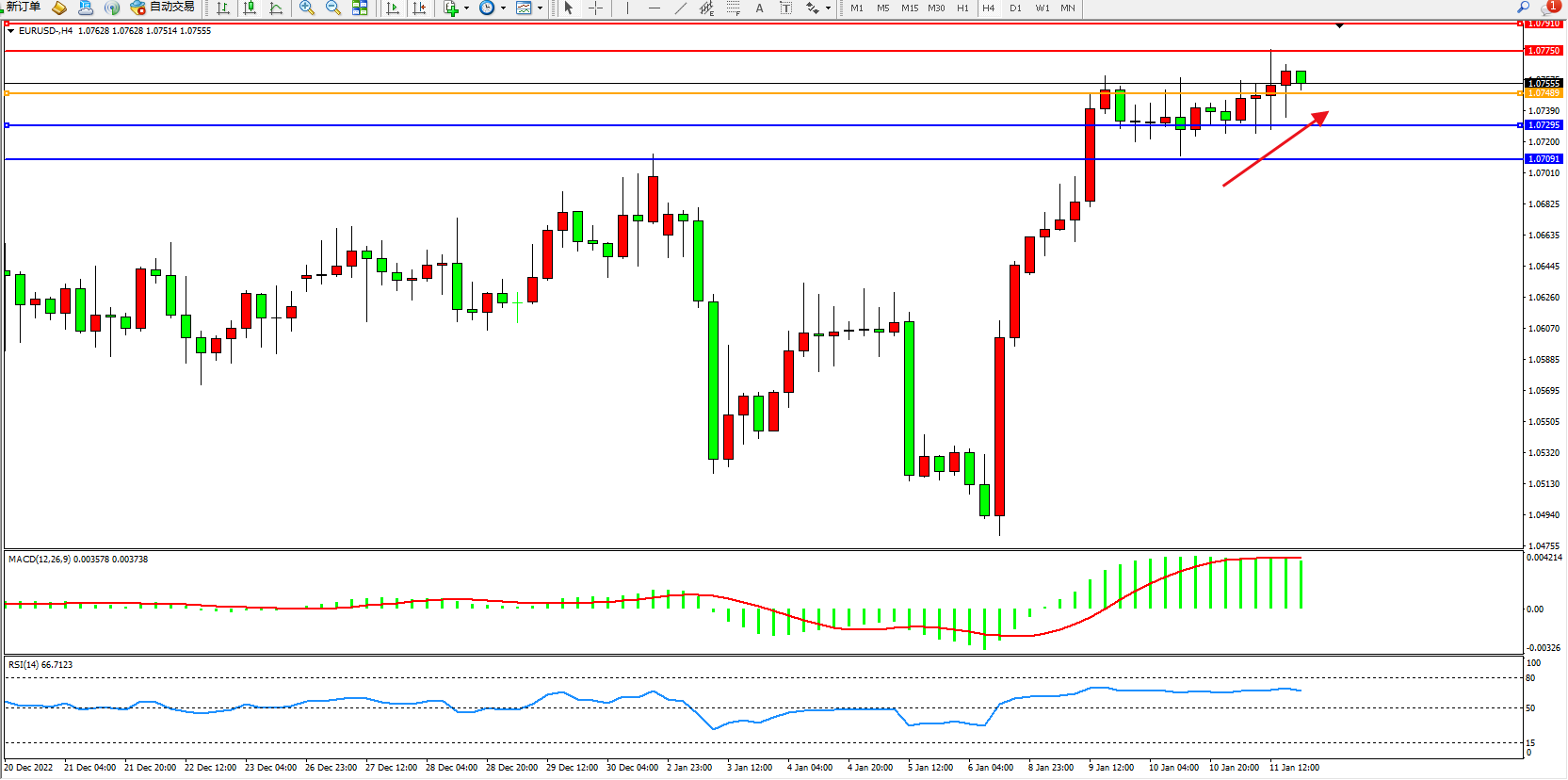 交易策略:1.07489上方看涨,目标1.07750、1.07910