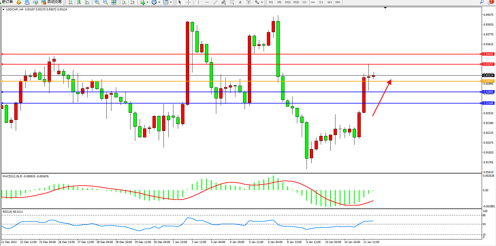 美元瑞郎USDCHF——4小时K线图显示:
