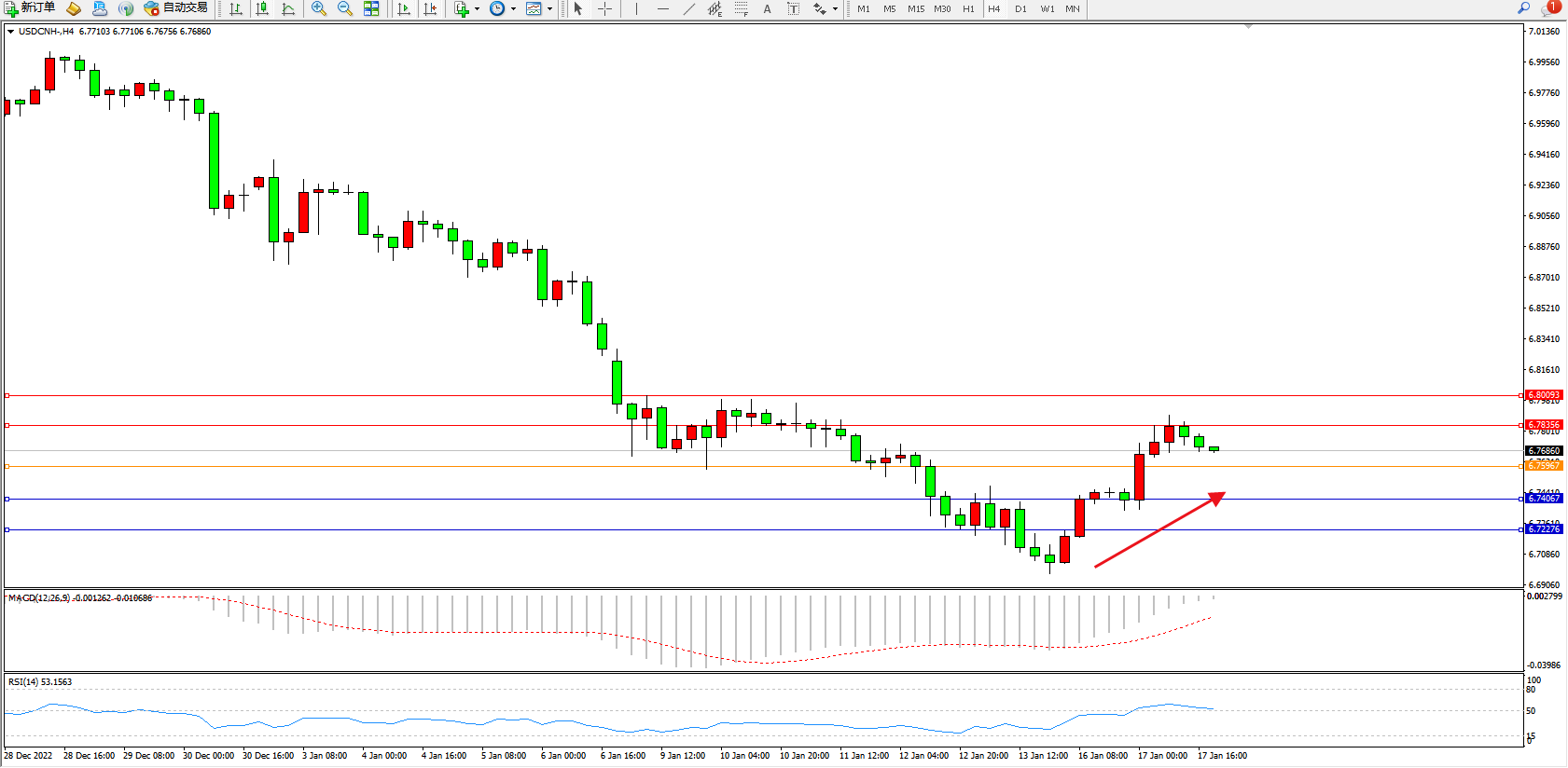 交易策略:6.75967上方看涨,目标6.78356、6.80093