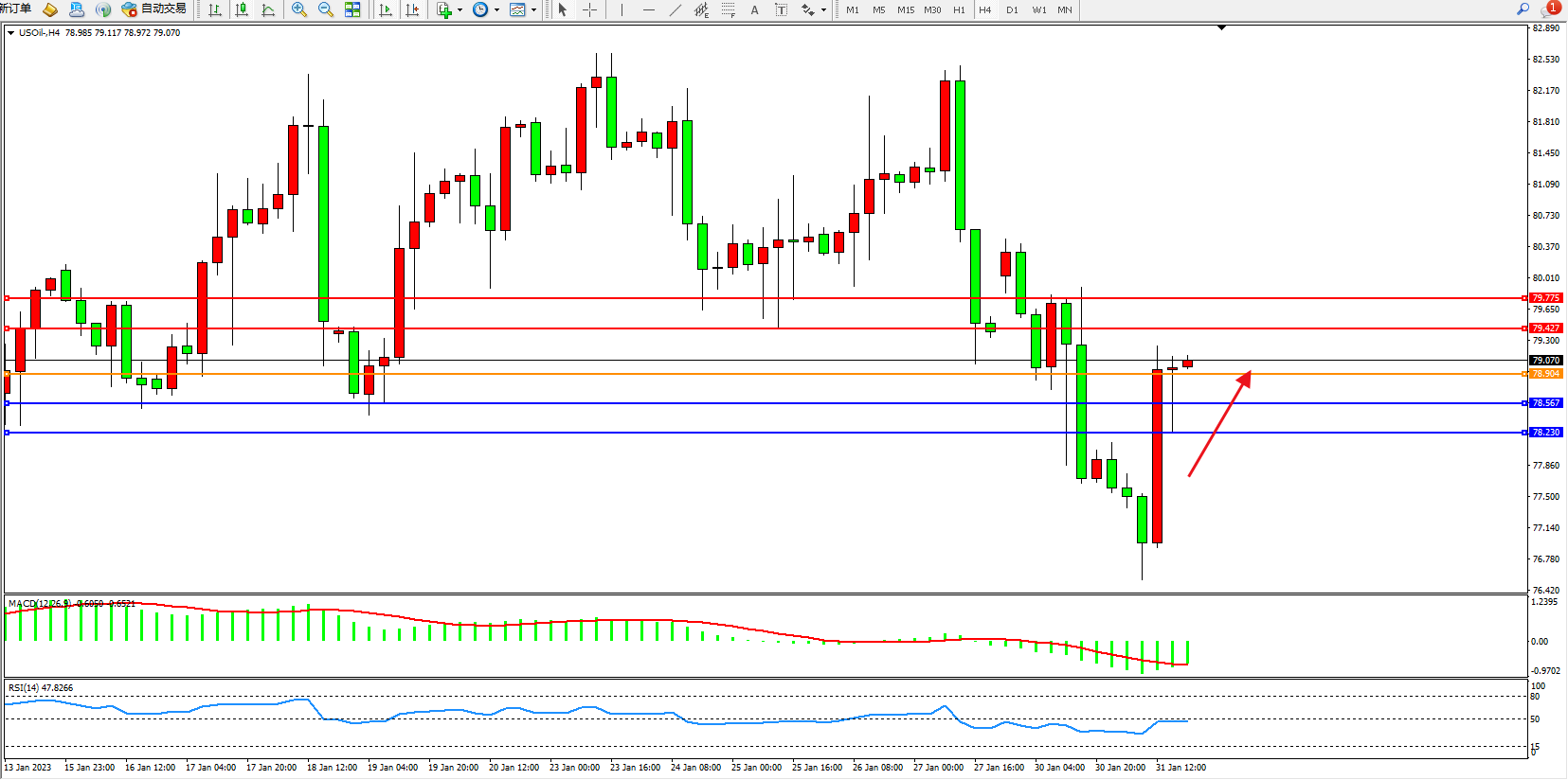 交易策略:78.904上方看涨,目标79.775、79.775