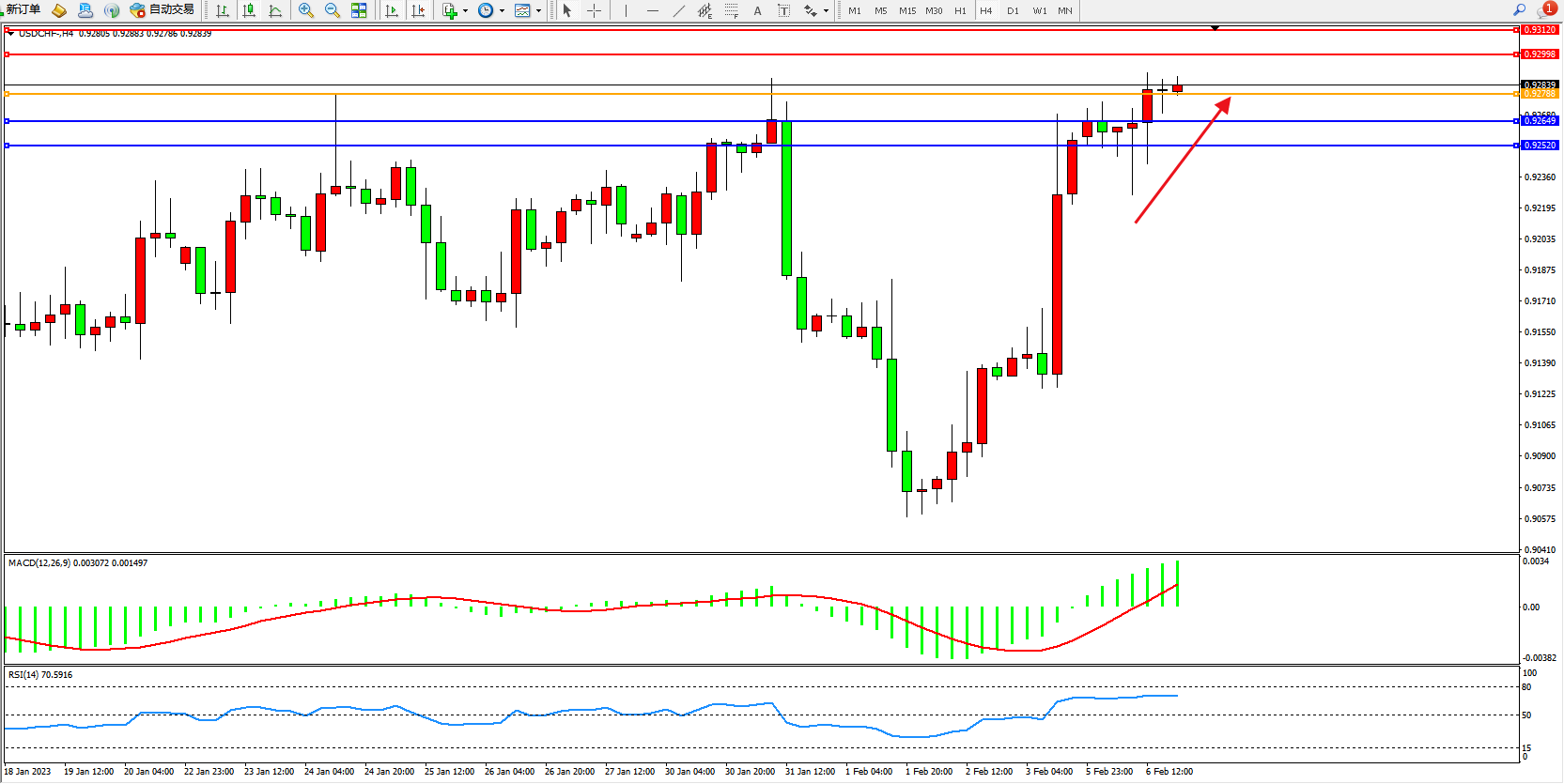 美元瑞郎USDCHF——4小时K线图显示: