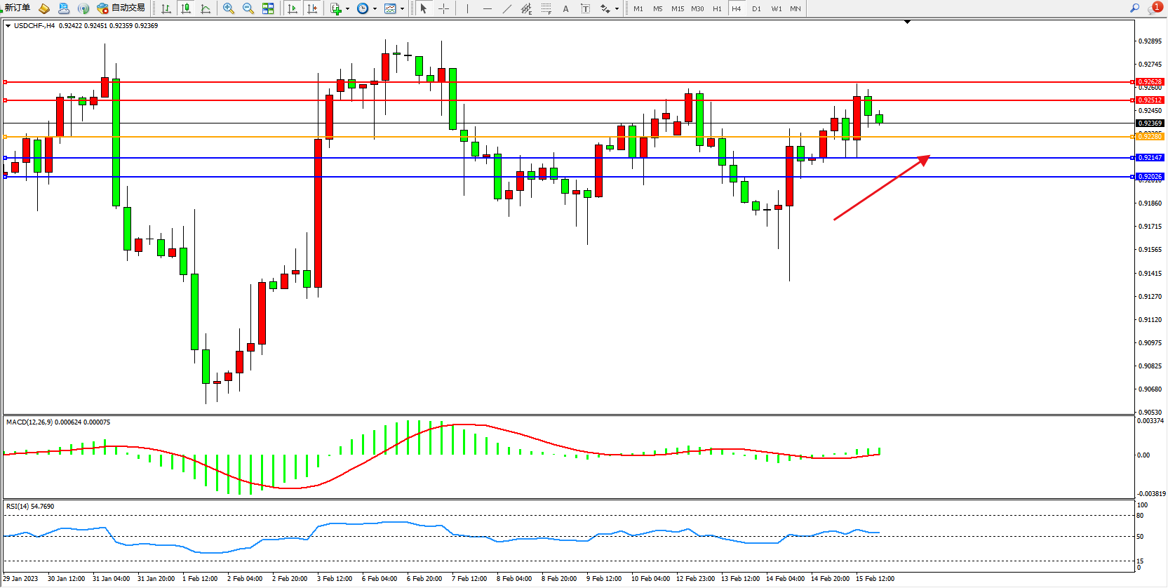 美元瑞郎USDCHF——4小时K线图显示: