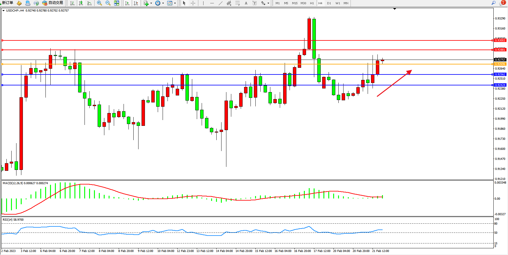 美元瑞郎USDCHF——4小时K线图显示: