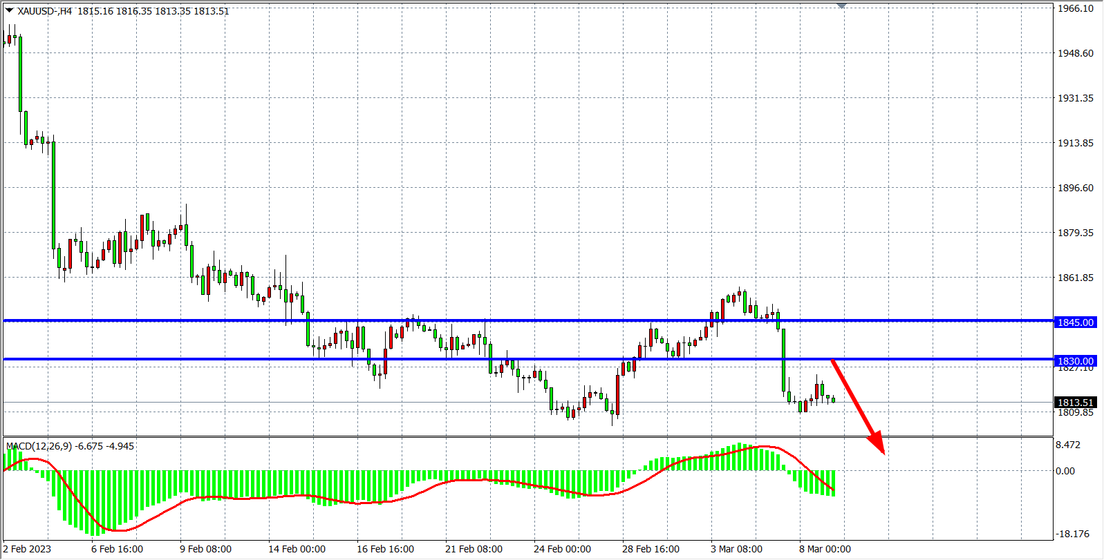 4小时图看,金价跌破1830的低点后反弹再次不破,MACD在零轴之下呈放量状态,强支撑1830转化为强阻力,日内在1830之下看跌,下看1800-1780附近。