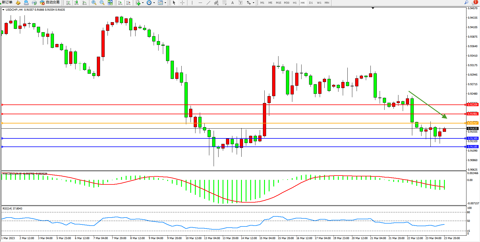 美元瑞郎USDCHF——4小时K线图显示: