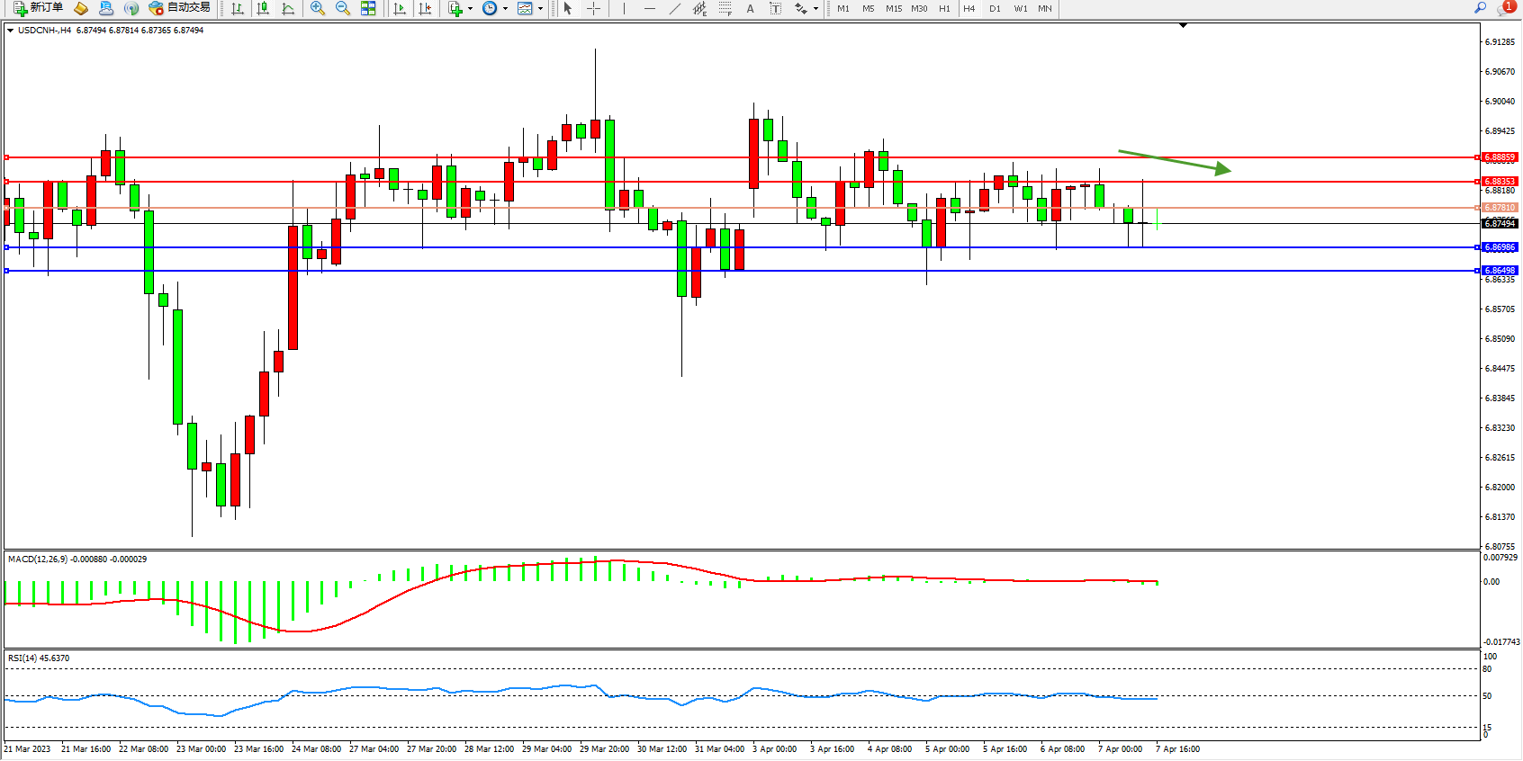 美元人民币USDCNH——4小时K线图显示: