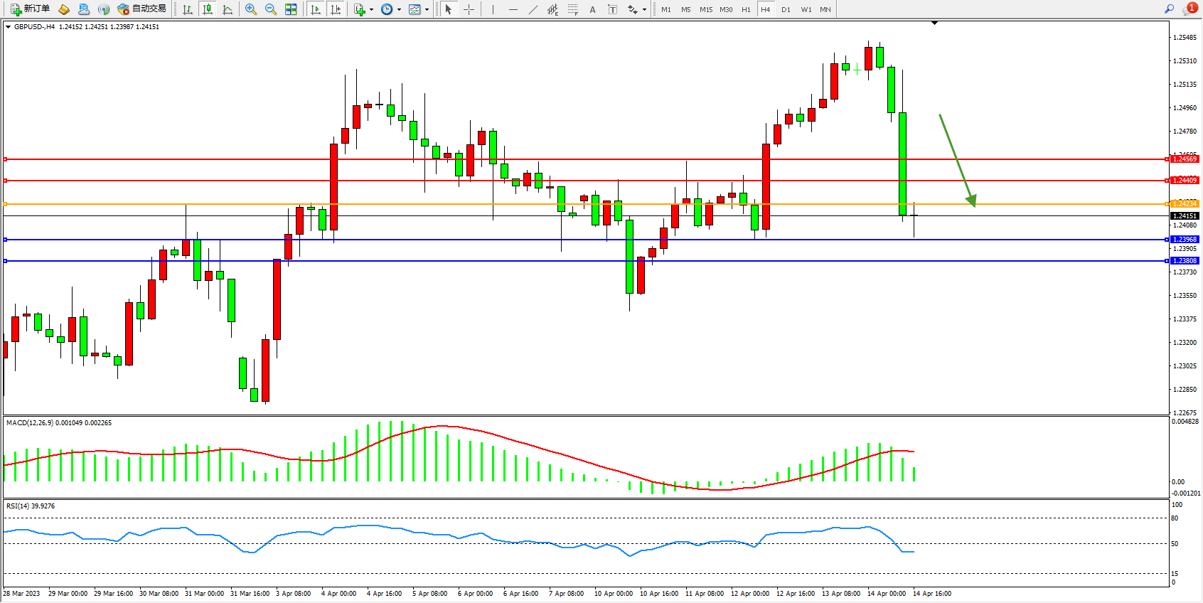 4小时图看:高位空头动力急速下挫,短期跌势未见止步,市场空头情绪笼罩,MACD指标处于多头区域震荡下移,RSI指标处于50均衡线下侧徘徊;