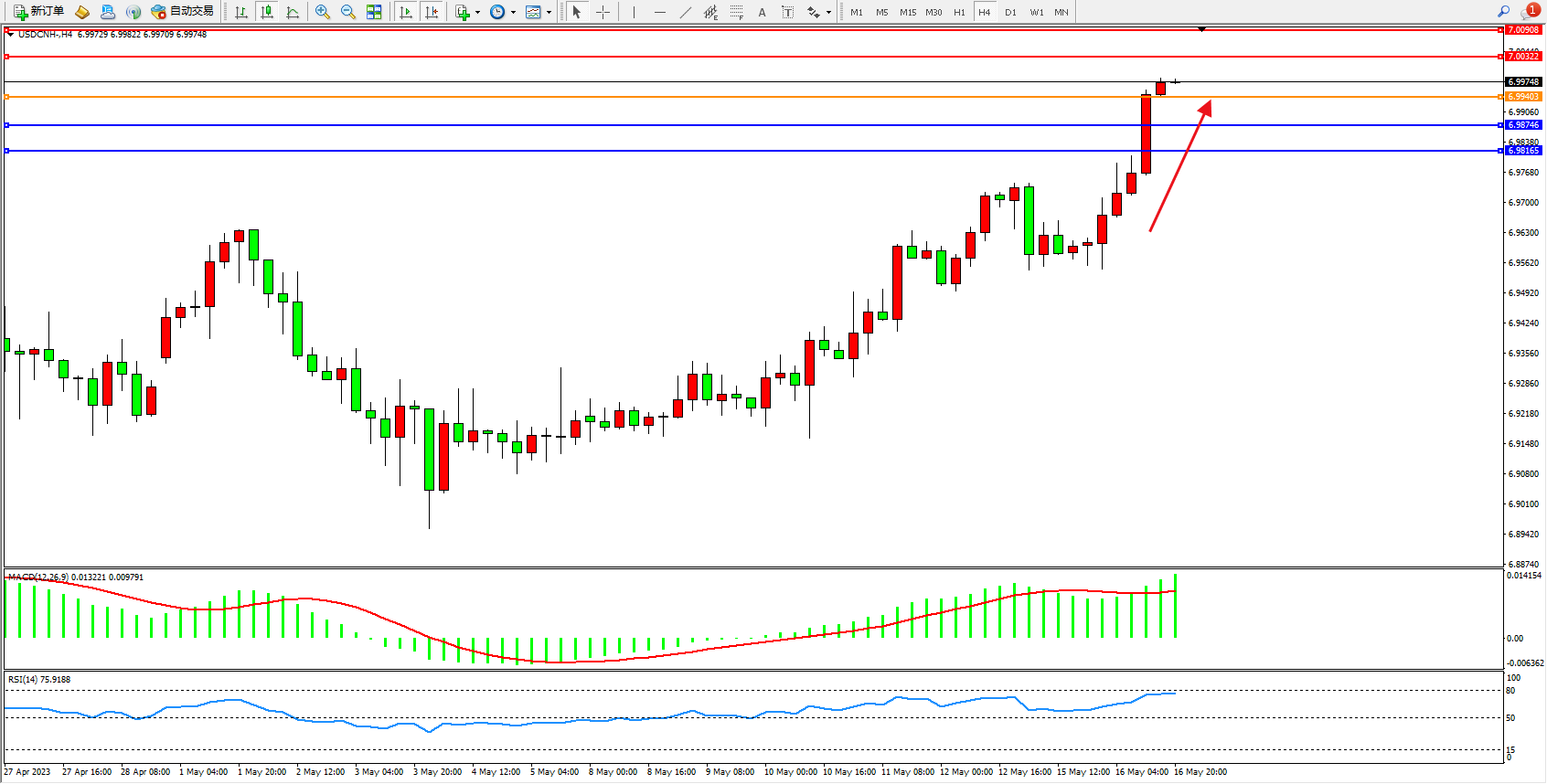 美元人民币USDCNH——4小时K线图显示: