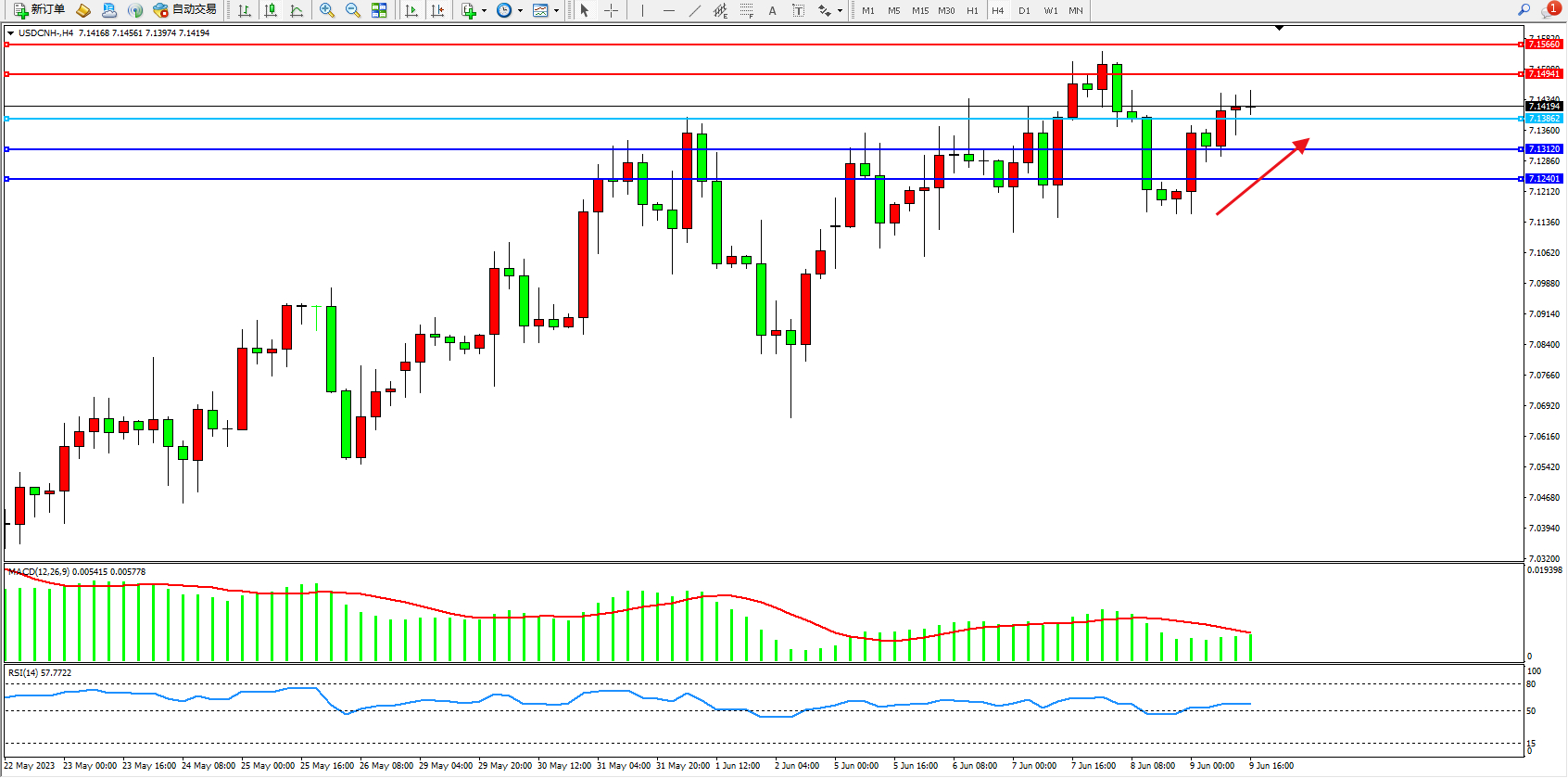 交易策略:7.13862下方看跌,目标7.13120 7.12401