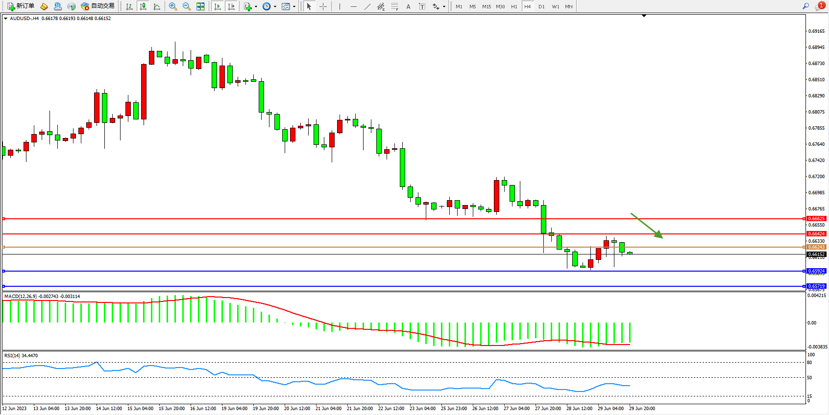 交易策略:0.66243下方看跌,目标0.65924  0.65719