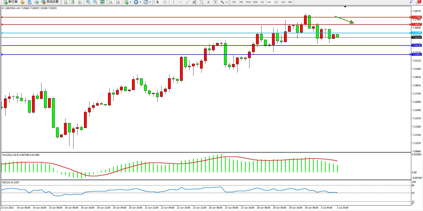 备选策略:7.25799上方看涨,目标7.26937 7.27908