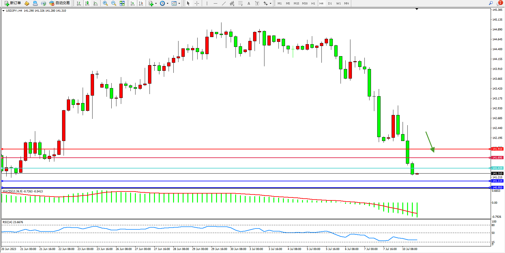 交易策略:141.439下方看跌,目标141.114 140.950