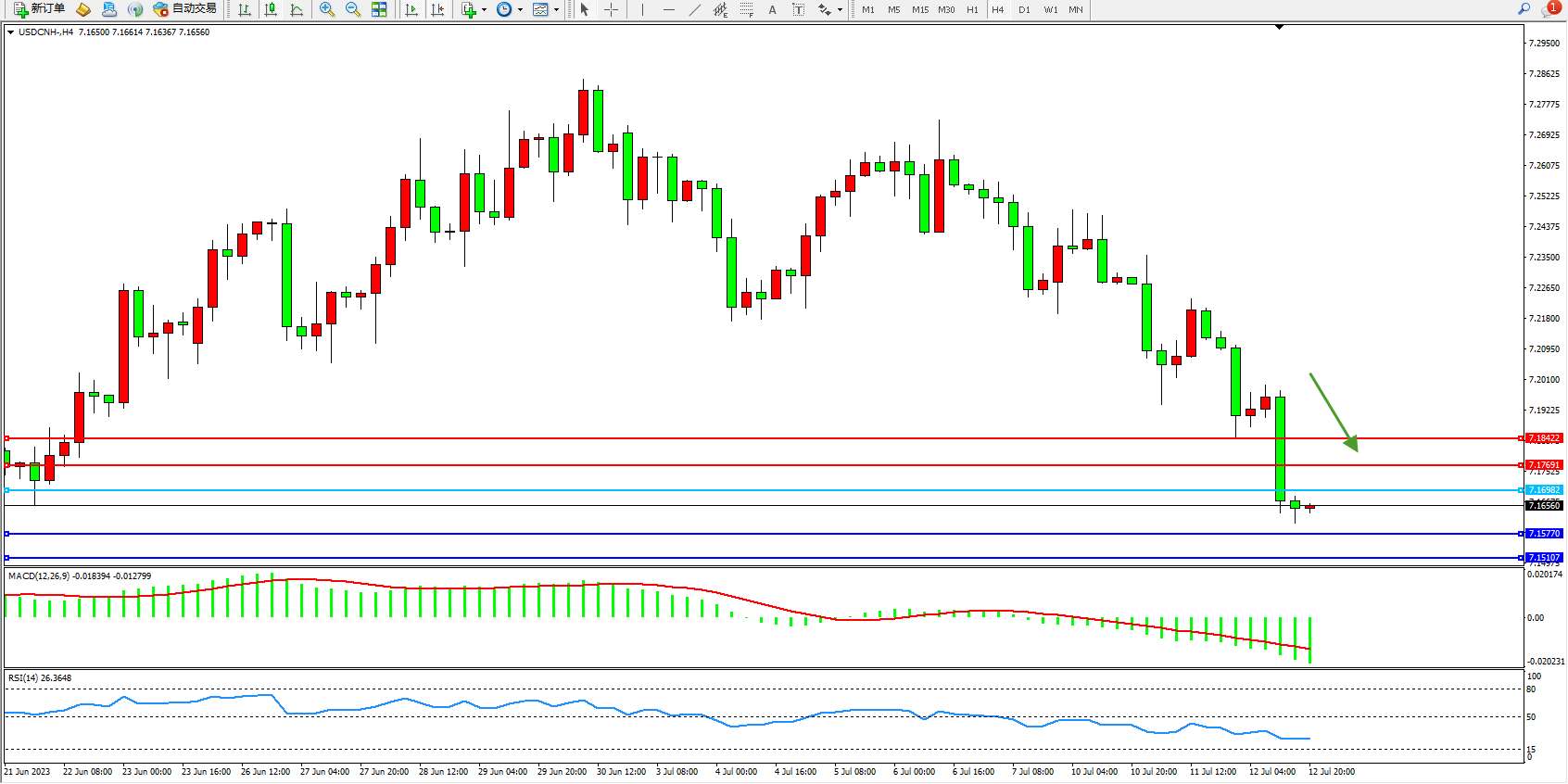 美元人民币USDCNH——4小时K线图显示: