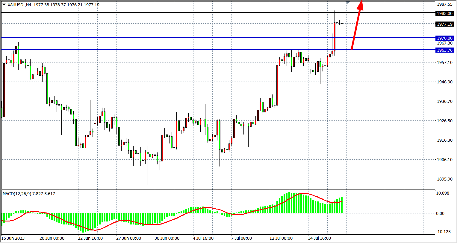 4小时图看,黄金在1950之上再度走高,MACD量能在零轴上放量,行情上行趋势明显,支撑上移1963-1970附近,上方阻力1990-2000。