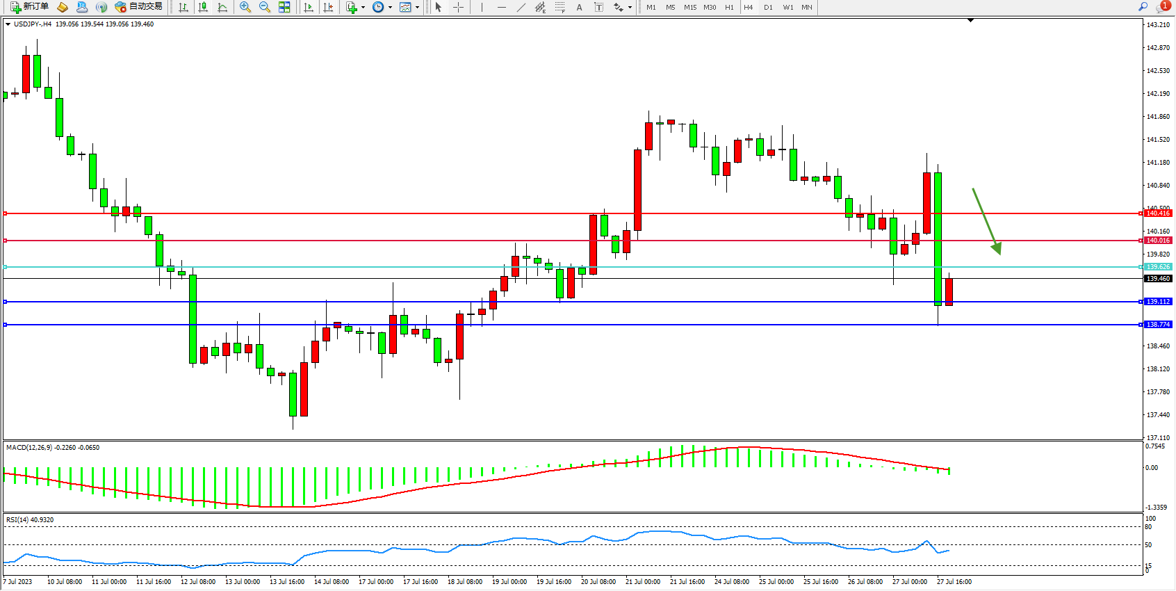 交易策略:139.626下方看跌,目标139.112 138.774