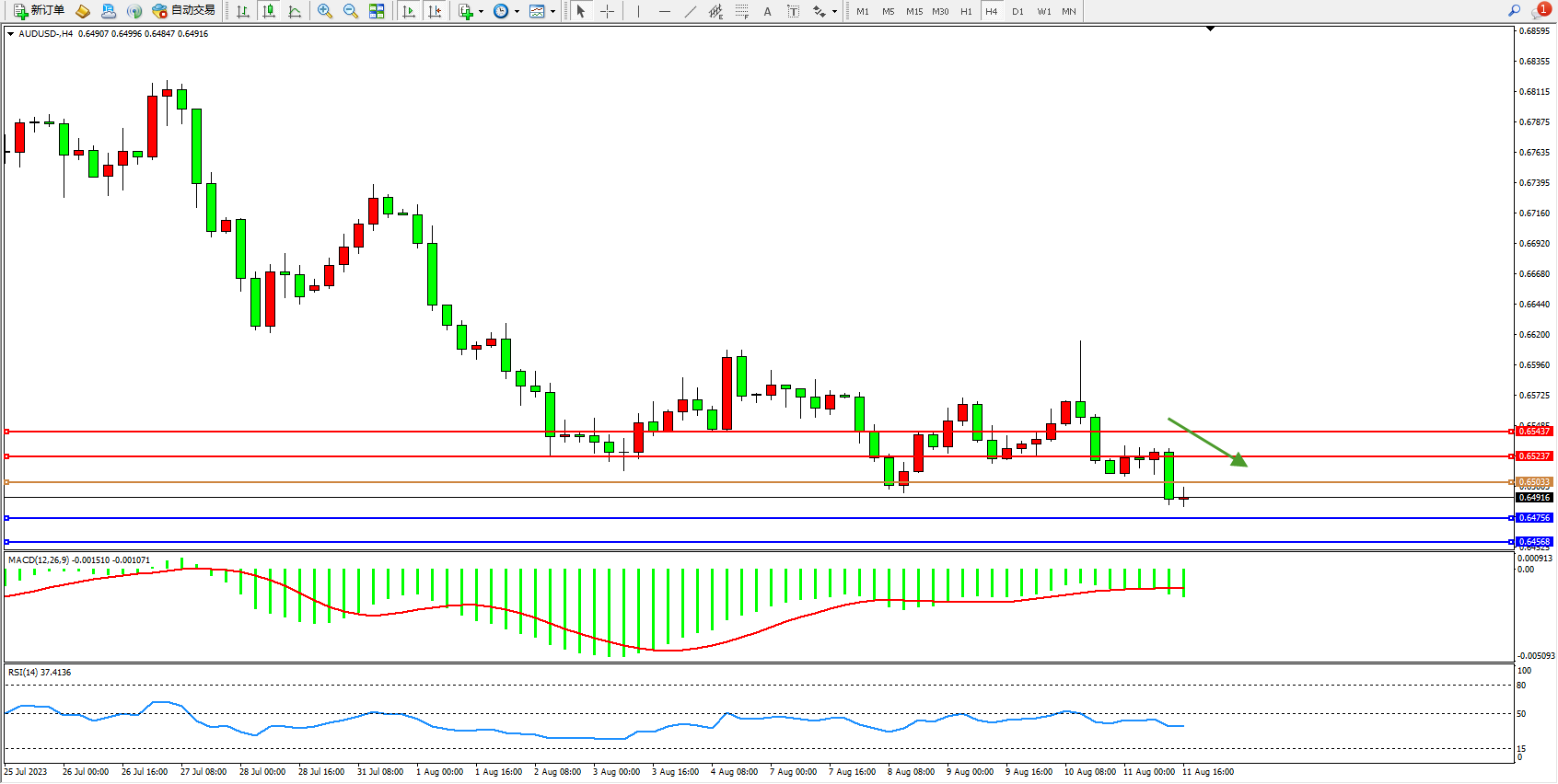 交易策略:0.65033下方看跌,目标0.64756 0.64568