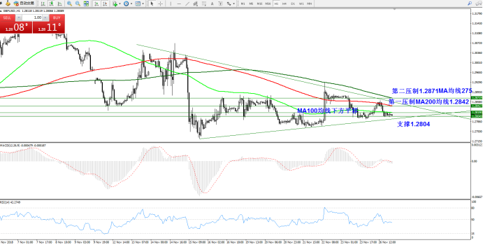交易策略:倾向于高位做空为主,关注第二压制1.2871位置附近伺机做空,目标看至1.2804;